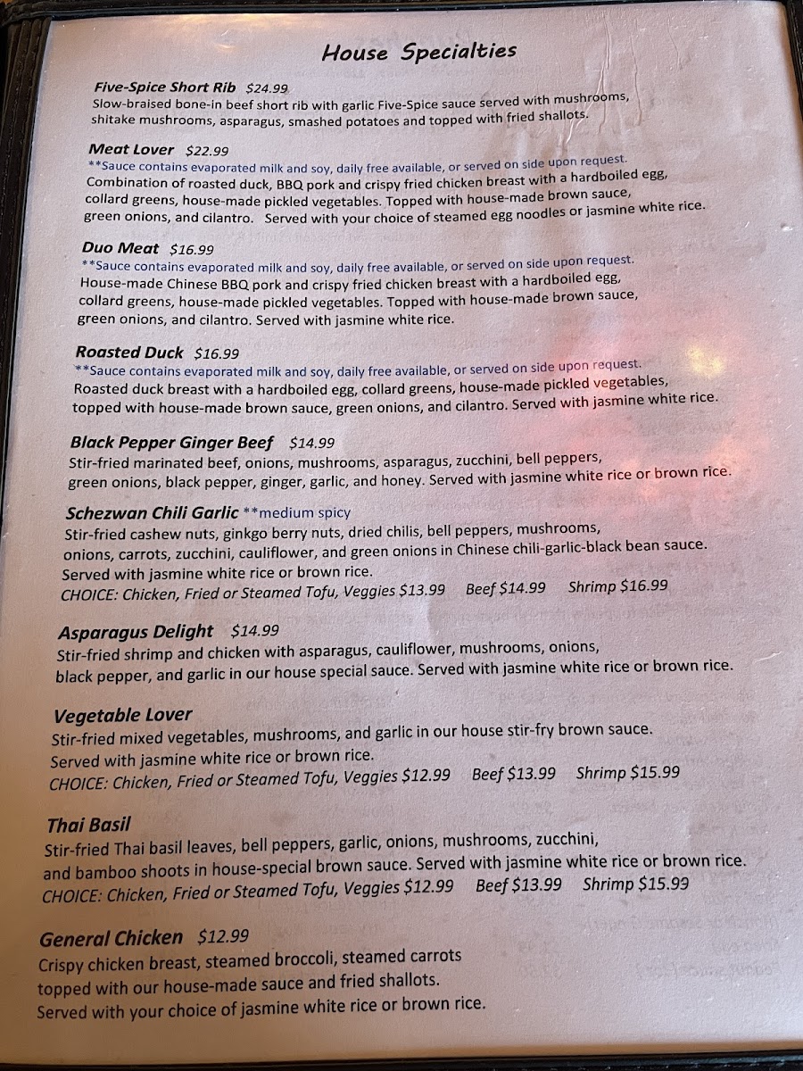 Start your journey with tantalizing small plates, such as Avocado Tacos and Korean Beef Tacos, which burst with fresh ingredients and bold flavors. For main courses, don’t miss the House Specialties like the exquisite Roasted Duck Breast served with jasmine rice, or the rich Five Spice Short Rib, slow-braised to perfection.
